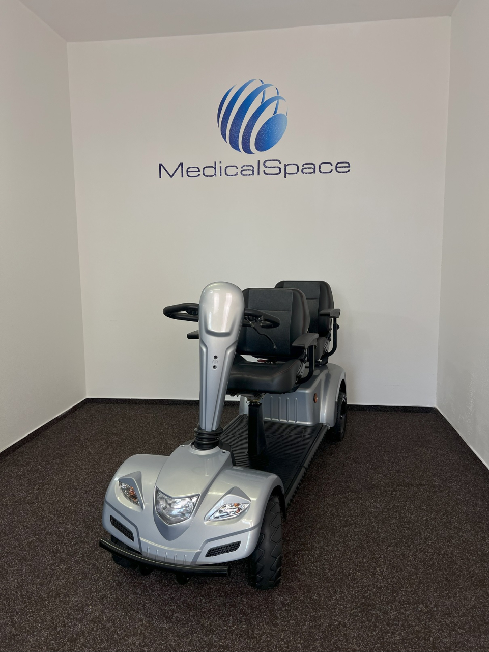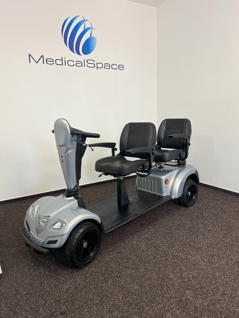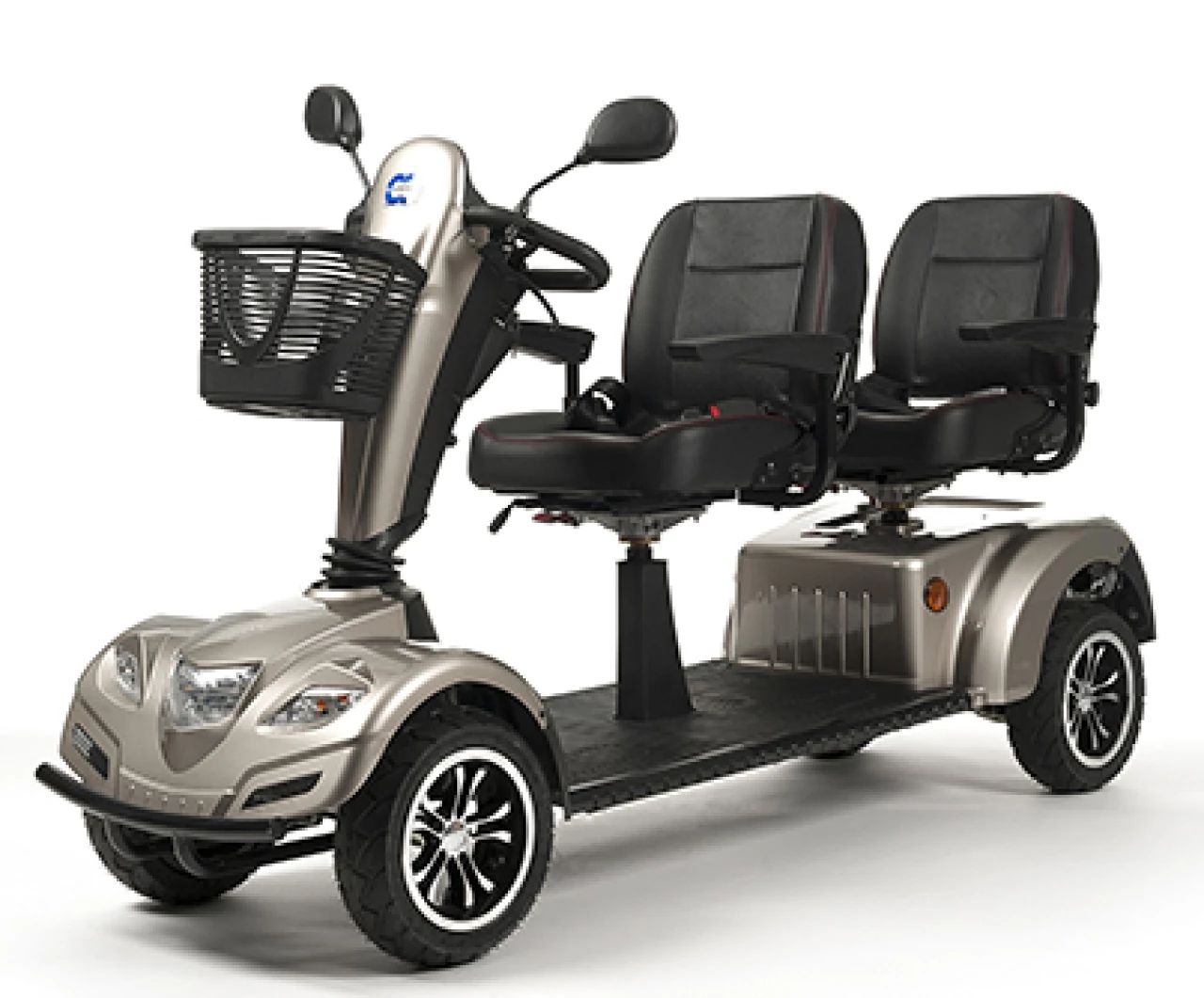 Dvoumístný elektrický skútr pro seniory, který svým uživatelům poskytne požitek z jízdy i při delších projížďkách. Má 2 komfortní nastavitelná sedadla a řídítka s nastavitelným sklonem, aby si je každý mohl jednoduše přizpůsobit svým potřebám a měl tak při jízdě maximální pohodlí. Všechny důležité informace při jízdě pak lze získat z přehledného displaye umístěného na řídícím panelu. Pod tímto displayem jsou umístěna tlačítka pro ovládání různých funkcí. Tato elektro čtyřkolka má elegantní vzhled a jednoduché ovládání.